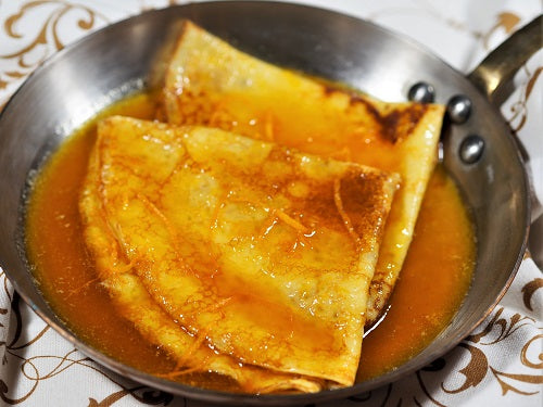 Crêpes Suzette is a classic French dessert that has been enjoyed for over a century. It is said to have originated in the late 19th century, when a young waiter accidentally set fire to a dish of crêpes he was preparing for the Prince of Wales' entourage. The quick-thinking chef who came to his rescue managed to turn the mistake into a delicious dessert by adding sugar, butter, orange juice, and Grand Marnier to the pan, creating a caramelized sauce that he poured over the crêpes. The dish was named after the young prince's companion, Suzette, and became an instant hit among French aristocrats and high society. Today, Crêpes Suzette is still considered a luxurious and elegant dessert, often served in fine dining restaurants and special occasions around the world. -